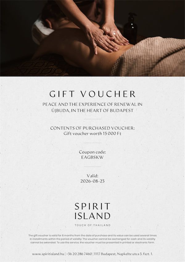 Our gift vouchers can be purchased in values between 15,000 and 150,000 HUF, so the recipient is free to choose from Spirit Island's massages and treatments according to their own needs.